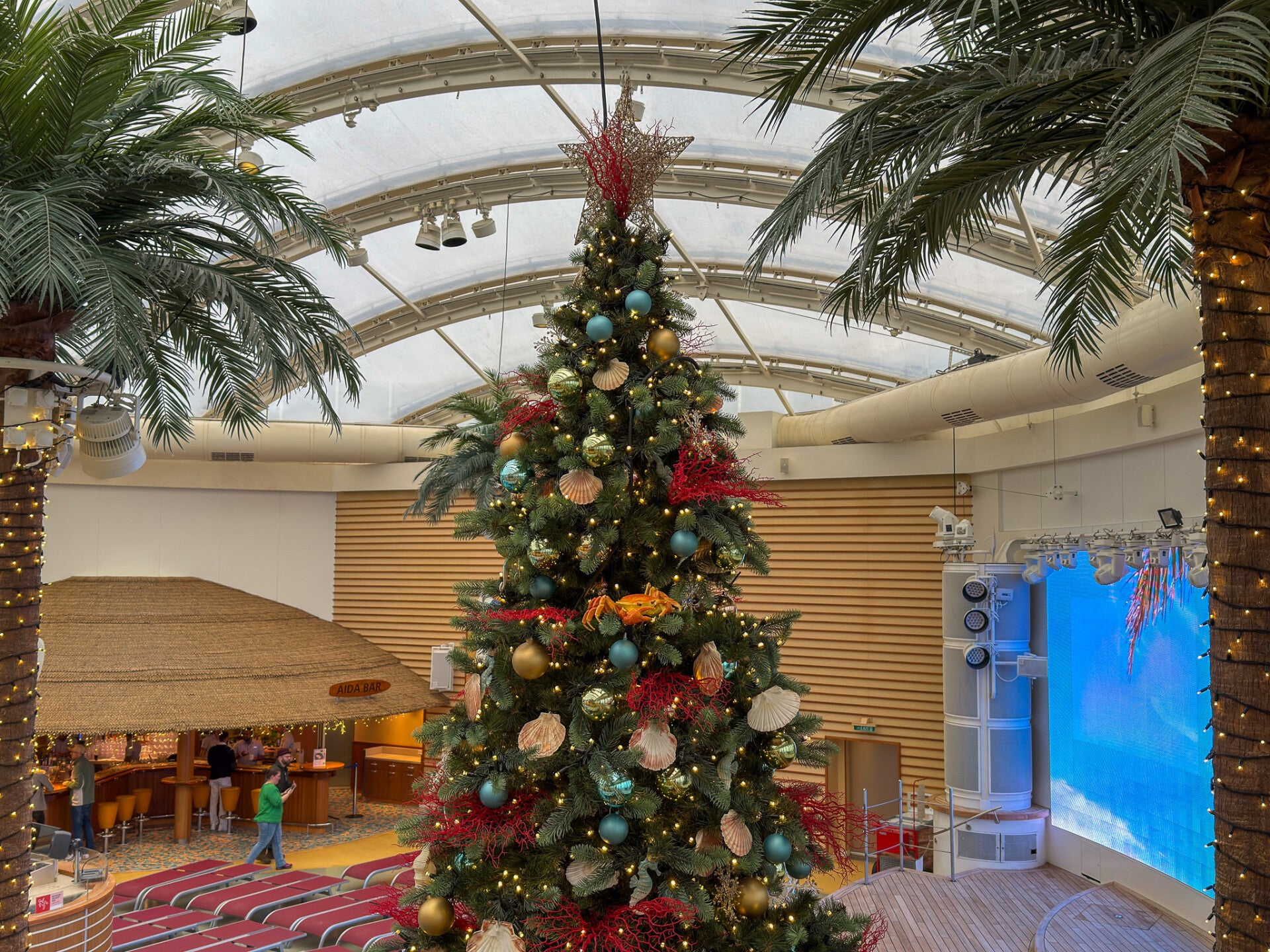 Bei aller Crime-Dichte bleibt AIDAnova natürlich AIDAnova: 17 Restaurants, eine Vielzahl an Bars, großes Spa, Pools, Fitness, Shows, Shopping – alles, was eine moderne AIDA-Klasse ausmacht. Kulinarisch reicht die Spanne von Buffetrestaurants mit Themenabenden über Spezialitätenrestaurants bis hin zu Street-Food-Konzepten; für viele Suiten- und Premiumgäste kommen bevorzugte Bereiche hinzu. An den Seetagen kann man problemlos einen halben Tag im Spa verbringen, Sauna mit Meerblick, Ruhezonen und Massagen inklusive, bevor man abends wieder im Theatrium sitzt und einem True-Crime-Talk lauscht. Für uns zu zweit war genau dieser Wechsel ideal: mal Paarzeit im Wellnessbereich, mal intensives Zuhören bei einem Vortrag, dann ein Drink an der Bar und Menschen beobachten. Das weihnachtliche Bordprogramm – stimmungsvolle Beleuchtung, Winterdrinks, manchmal sogar ein Hauch Weihnachtsmusik – legt sich wie eine warme Hülle um ein inhaltlich eher düsteres Thema.